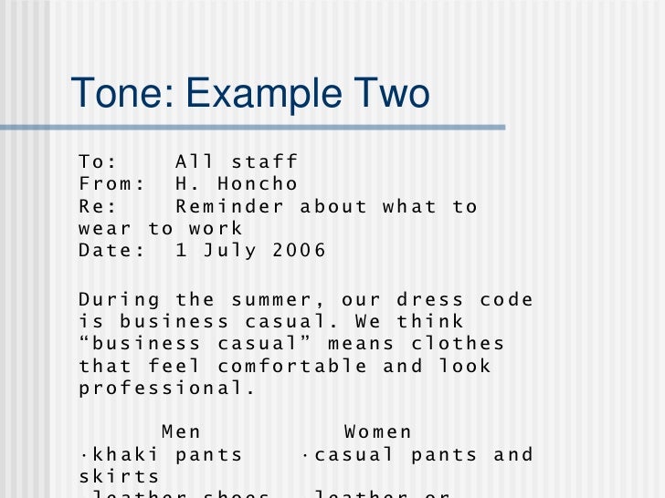 24 01 2005 A Polite E Mail About The Dress Code Forums Formal General Business Letter Writing 5 19 245 Our office has a formal dress code and we would feel that you are more a part of us if you would dress a little more like we do for instance wearing a tie and slacks and maybe a jacket would be enough email protected